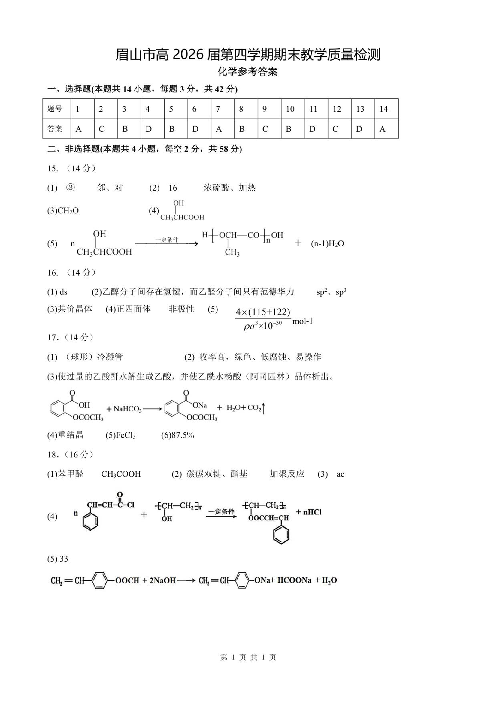 高二化学答案--四川省眉山市高2026届第四学期期末教学质量检测