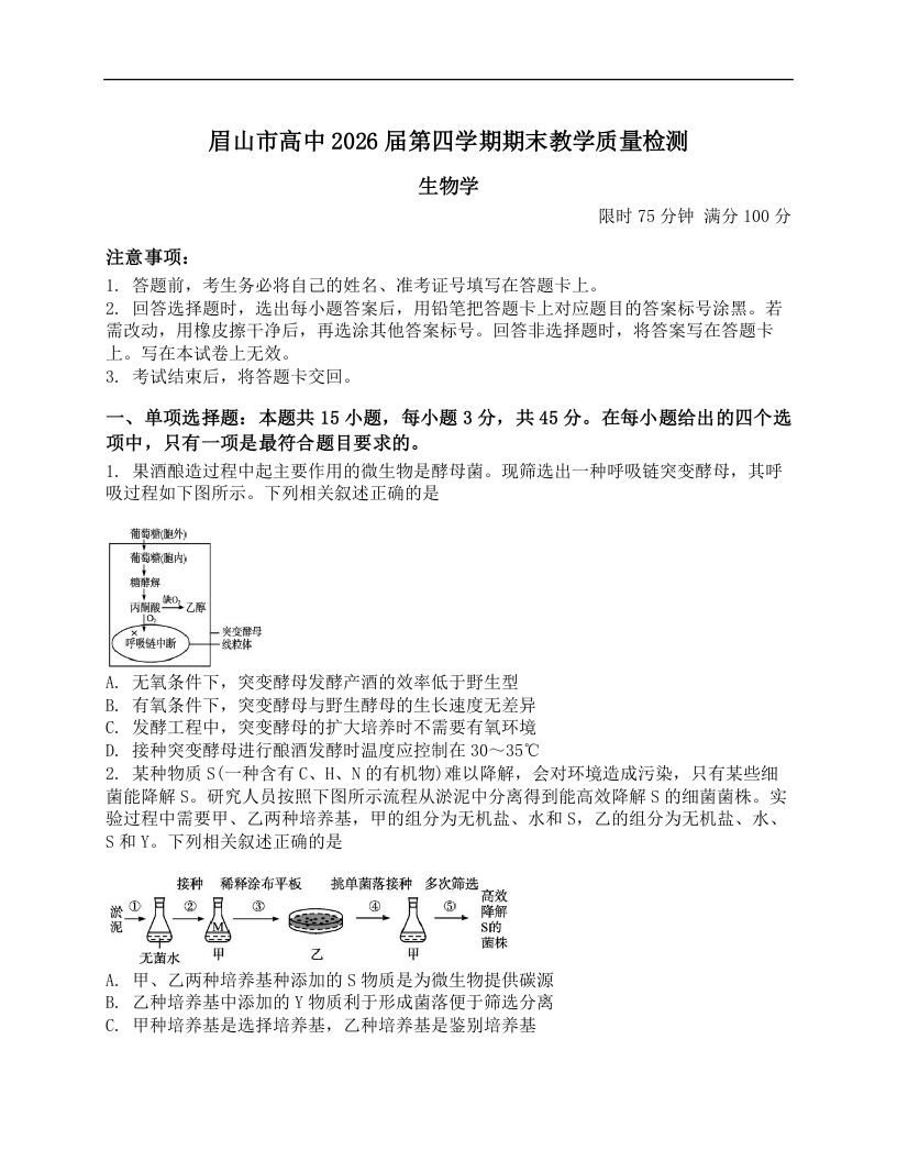 高二生物+答案--四川省眉山市高2026届第四学期期末教学质量检测