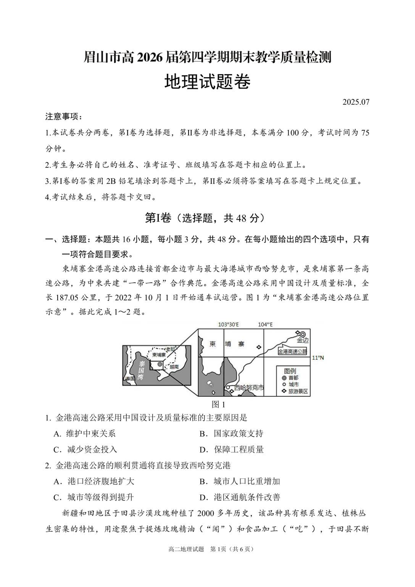 高二地理--四川省眉山市高2026届第四学期期末教学质量检测