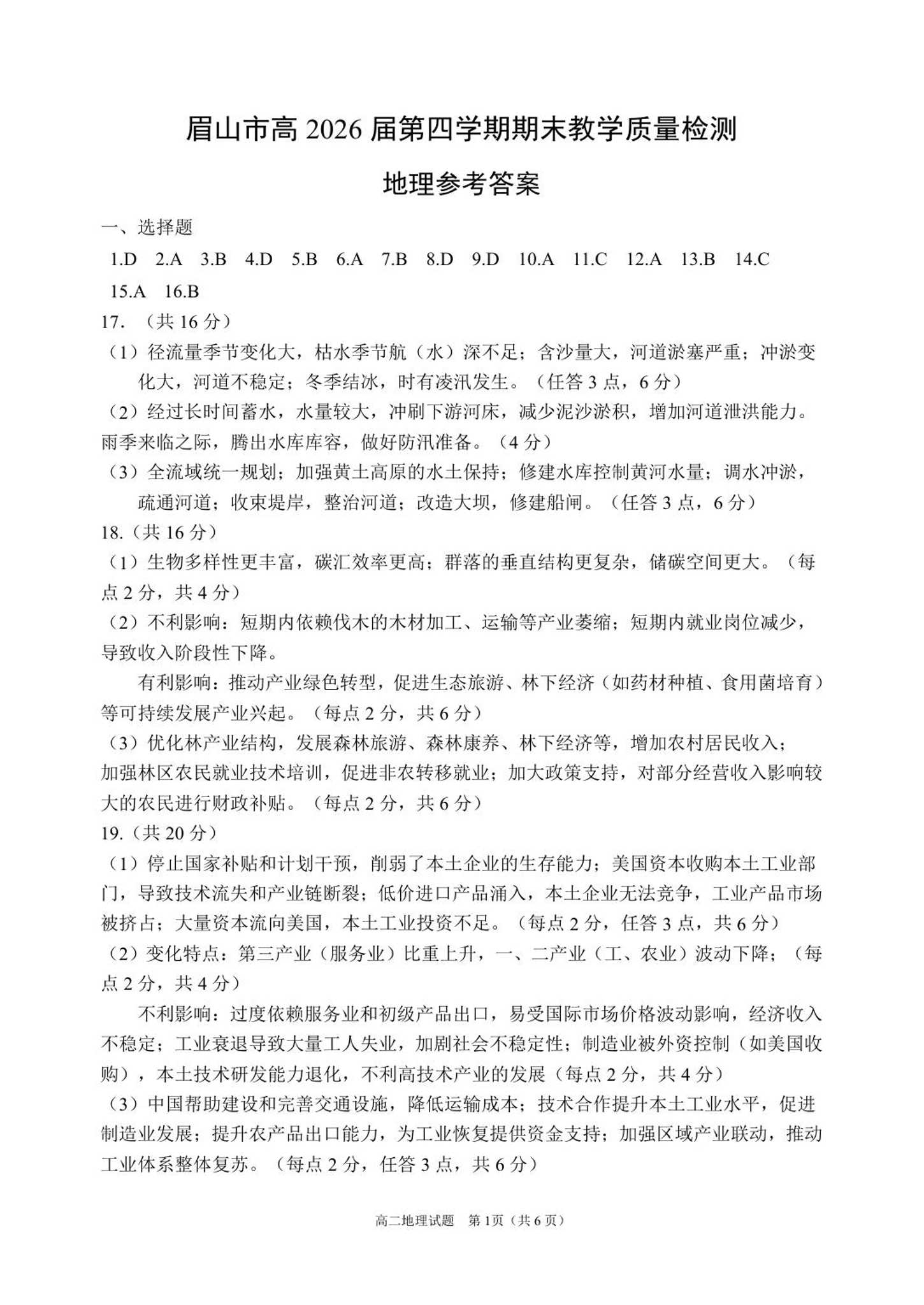 高二地理答案--四川省眉山市高2026届第四学期期末教学质量检测