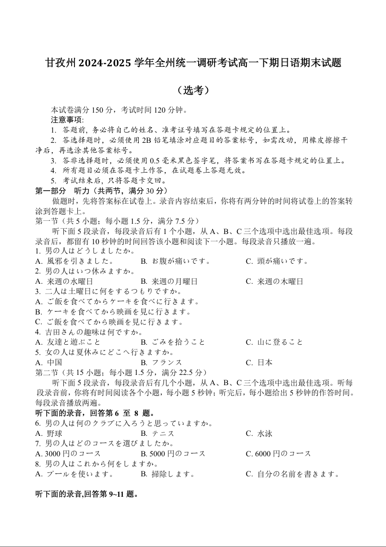 高一日语+答案--四川省甘孜藏族自治州2024-2025学年高一下学期7月期末全州统一调研考试