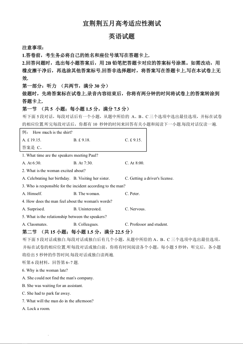 湖北省宜荆荆2024届高三下学期五月适应考英语+答案