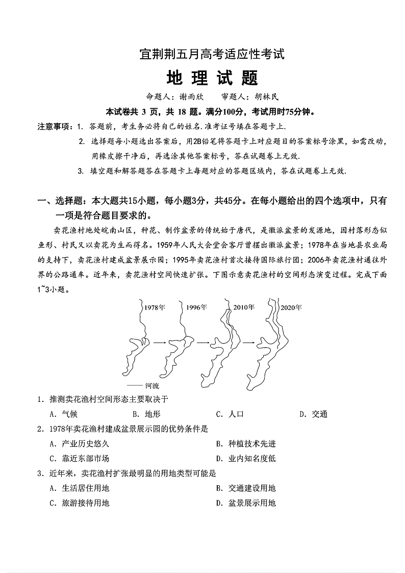 湖北省宜荆荆2024届高三下学期五月适应考地理+答案