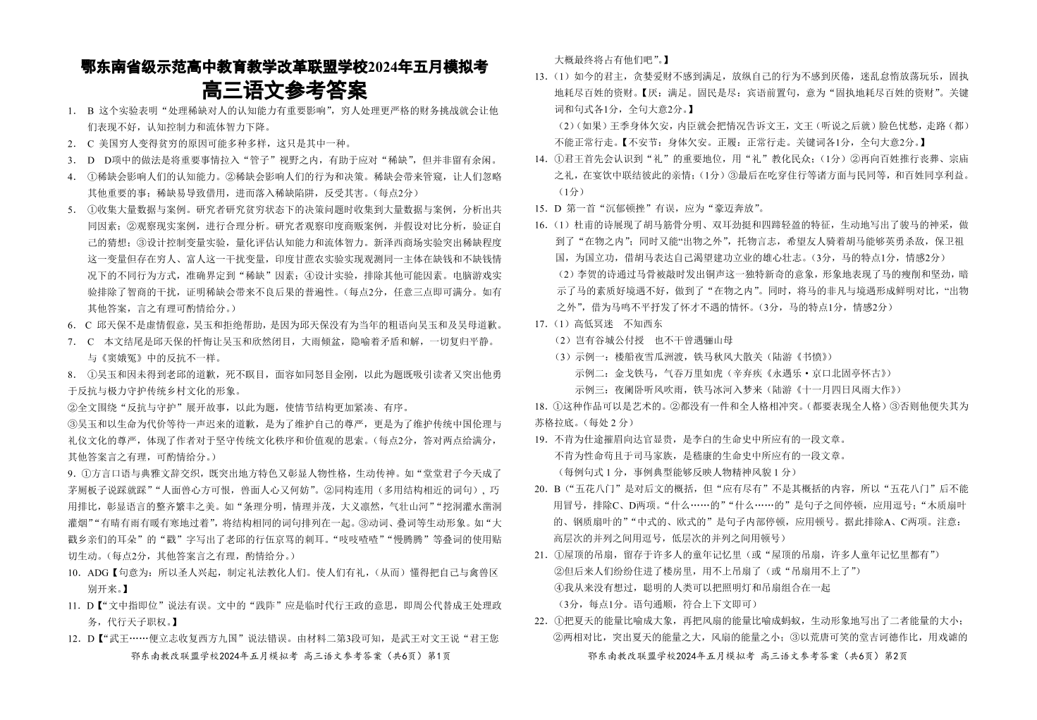 湖北省鄂东南省级示范高中教育教学改革联盟 2024 年高三五月模拟考语文答案