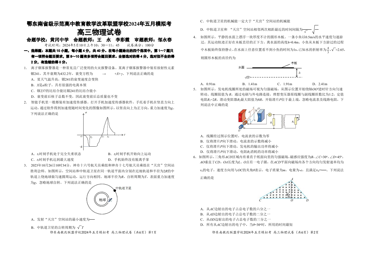 湖北省鄂东南省级示范高中教育教学改革联盟 2024 年高三五月模拟考物理