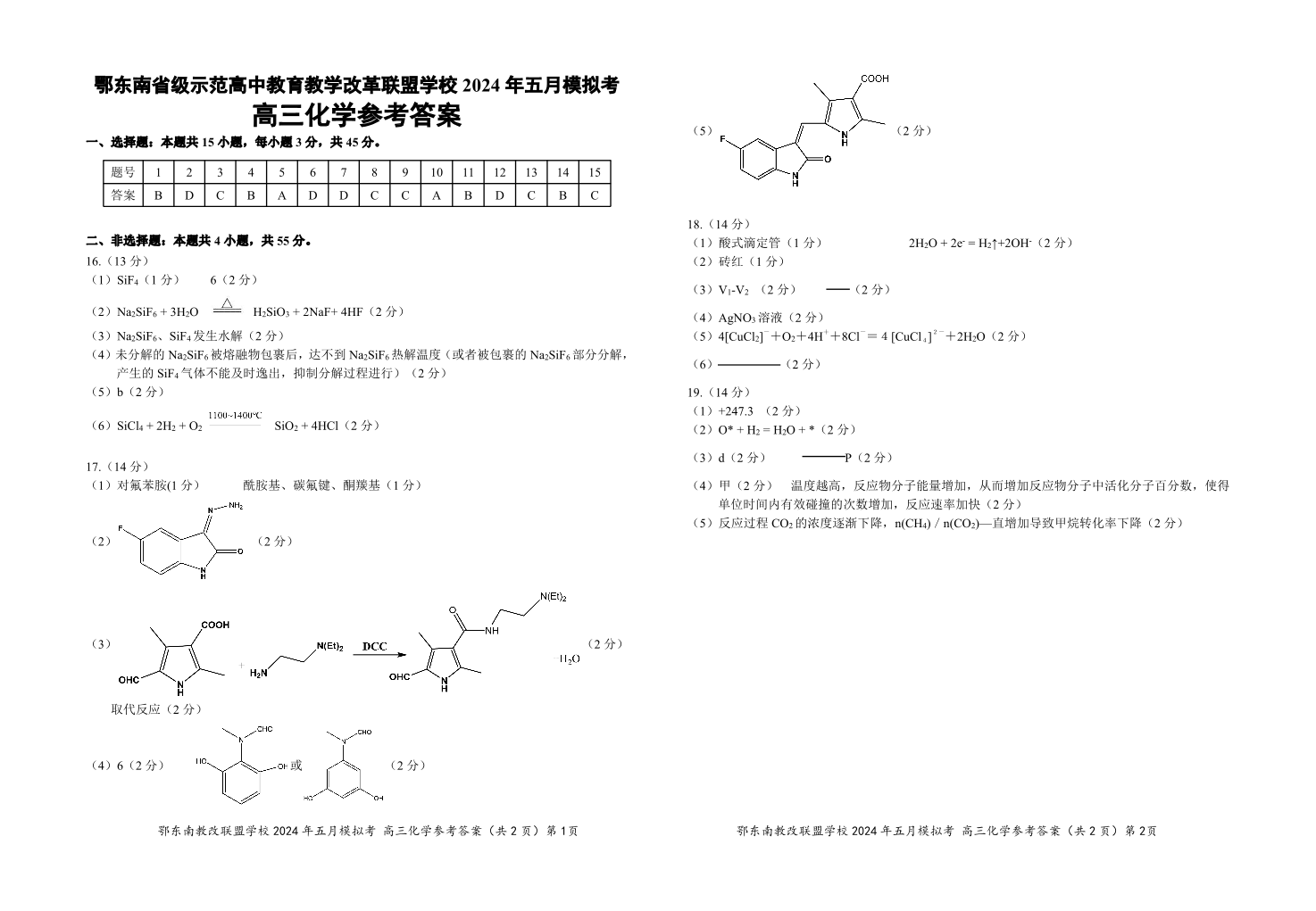 湖北省鄂东南省级示范高中教育教学改革联盟 2024 年高三五月模拟考化学答案