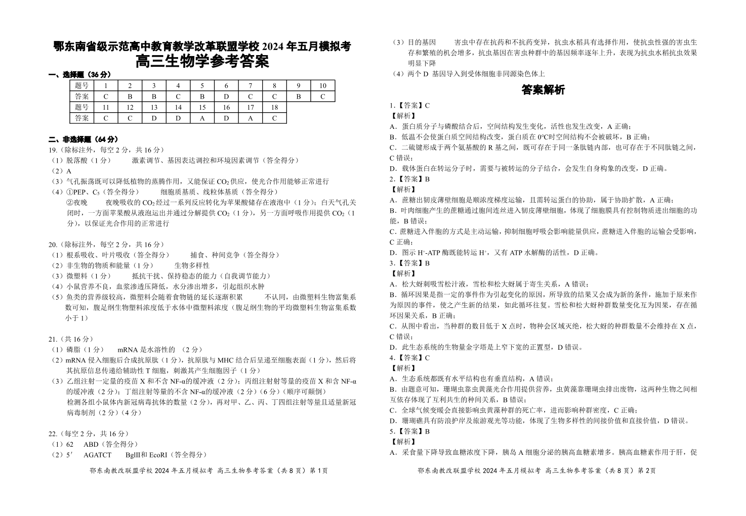 湖北省鄂东南省级示范高中教育教学改革联盟 2024 年高三五月模拟考生物答案