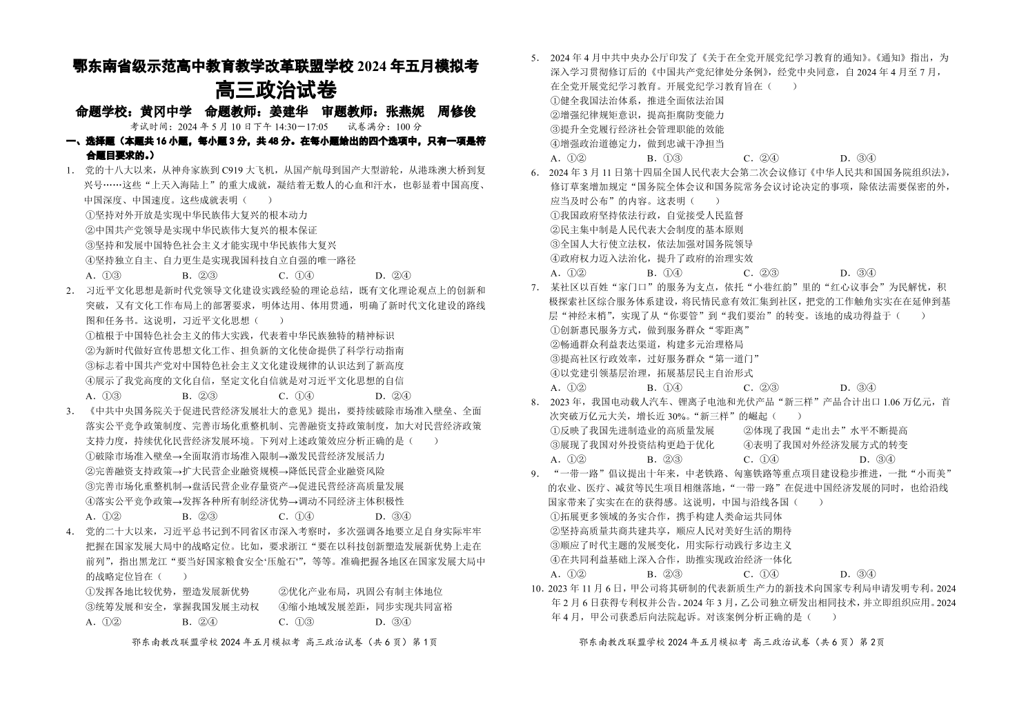 湖北省鄂东南省级示范高中教育教学改革联盟 2024 年高三五月模拟考政治