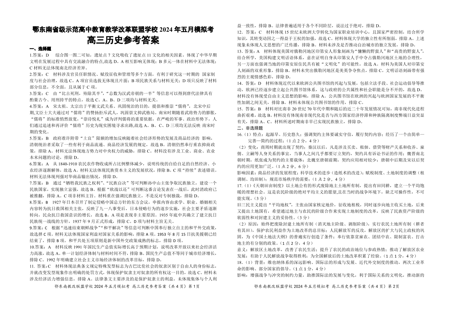 湖北省鄂东南省级示范高中教育教学改革联盟 2024 年高三五月模拟考历史答案