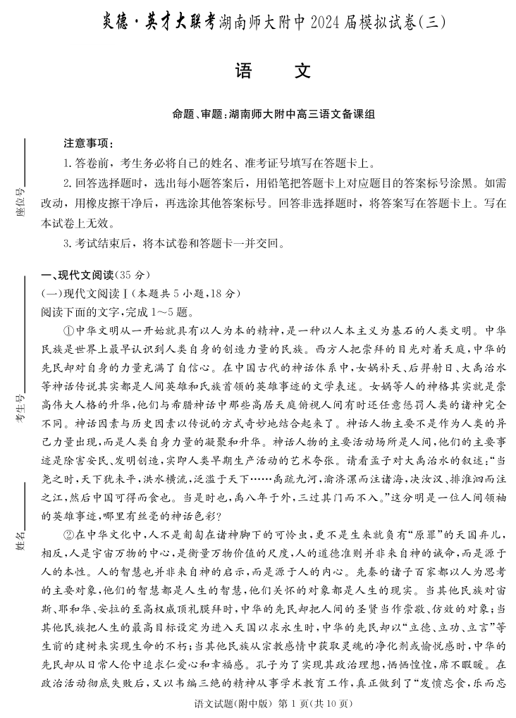 湖南省湖南师范大学附属中学2024届高三下学期模拟(三)语文
