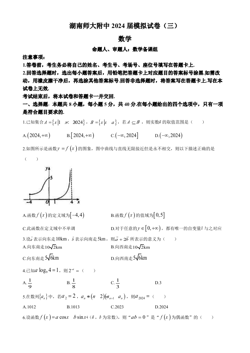 湖南省湖南师范大学附属中学2024届高三下学期模拟(三)数学