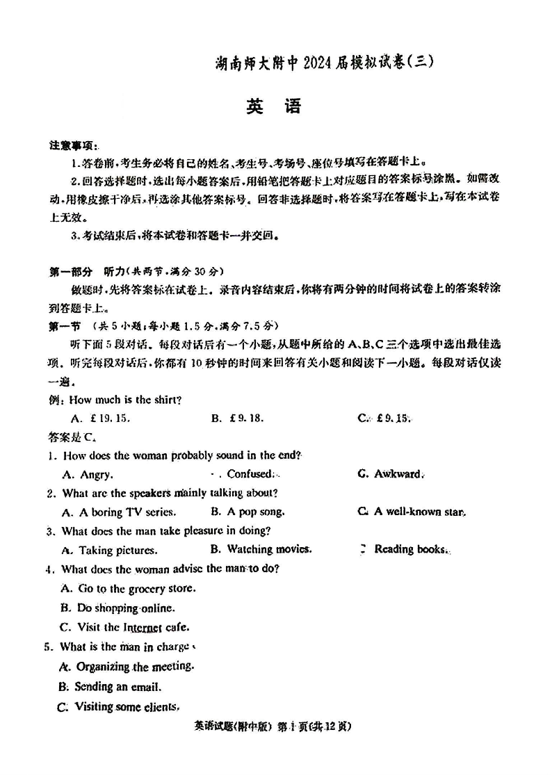 湖南省湖南师范大学附属中学2024届高三下学期模拟(三)英语