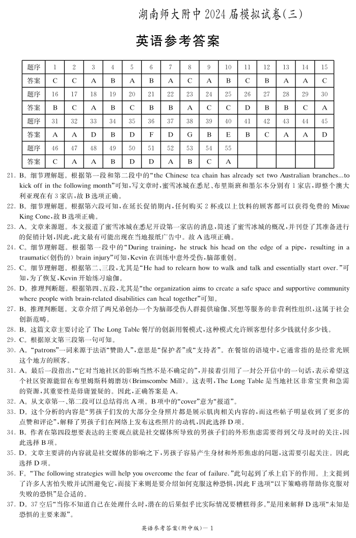 湖南省湖南师范大学附属中学2024届高三下学期模拟(三)英语答案