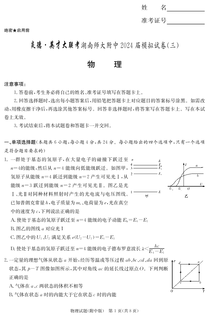 湖南省湖南师范大学附属中学2024届高三下学期模拟(三)物理