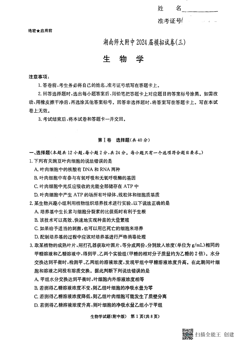 湖南省湖南师范大学附属中学2024届高三下学期模拟(三)生物