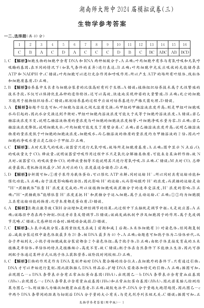 湖南省湖南师范大学附属中学2024届高三下学期模拟(三)生物答案
