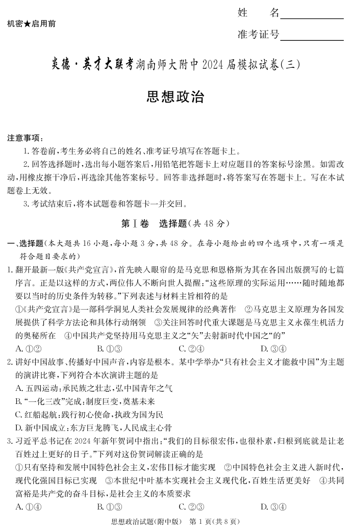 湖南省湖南师范大学附属中学2024届高三下学期模拟(三)政治