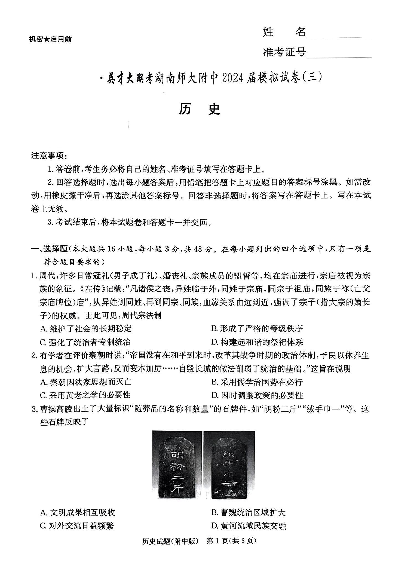 湖南省湖南师范大学附属中学2024届高三下学期模拟(三)历史