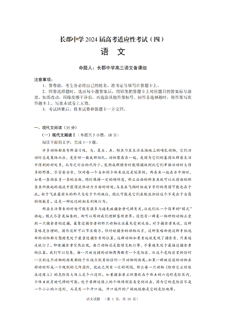 湖南省长郡中学2024届高三高考适应考试(四)语文