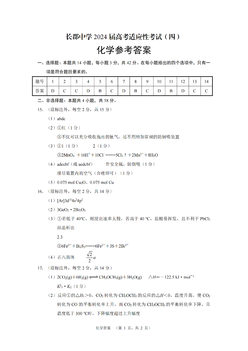 湖南省长郡中学2024届高三高考适应考试(四)化学答案