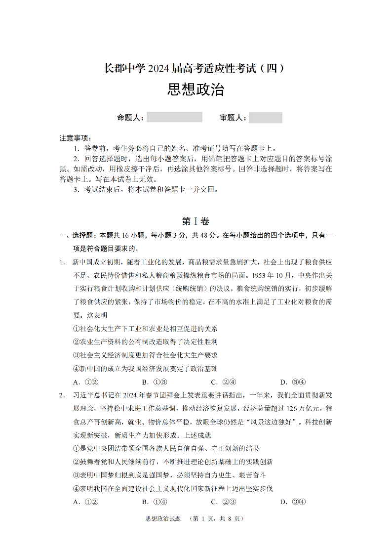 湖南省长郡中学2024届高三高考适应考试(四)政治