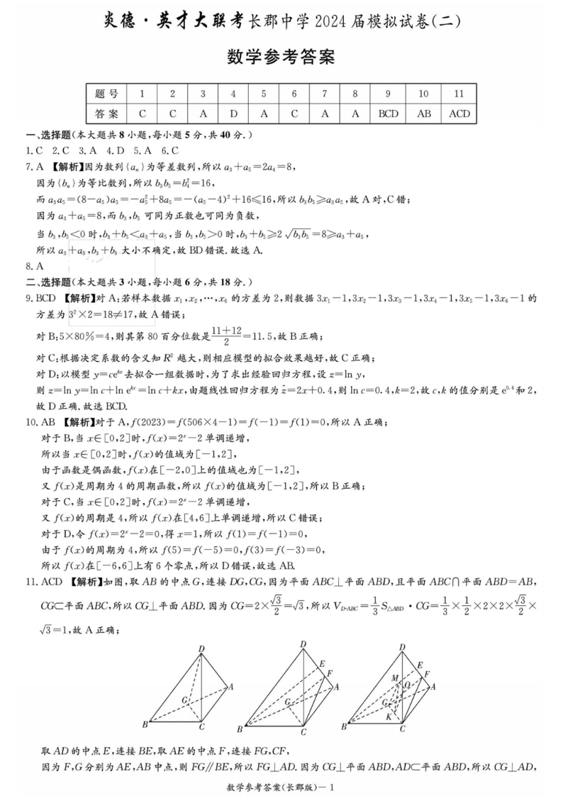 湖南省长郡中学2024届高三模拟考(二)数学答案