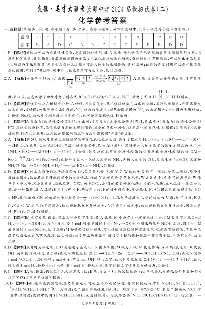 湖南省长郡中学2024届高三模拟考(二)化学答案