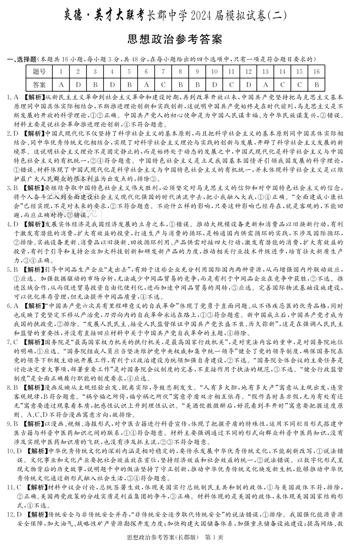 湖南省长郡中学2024届高三模拟考(二)政治答案