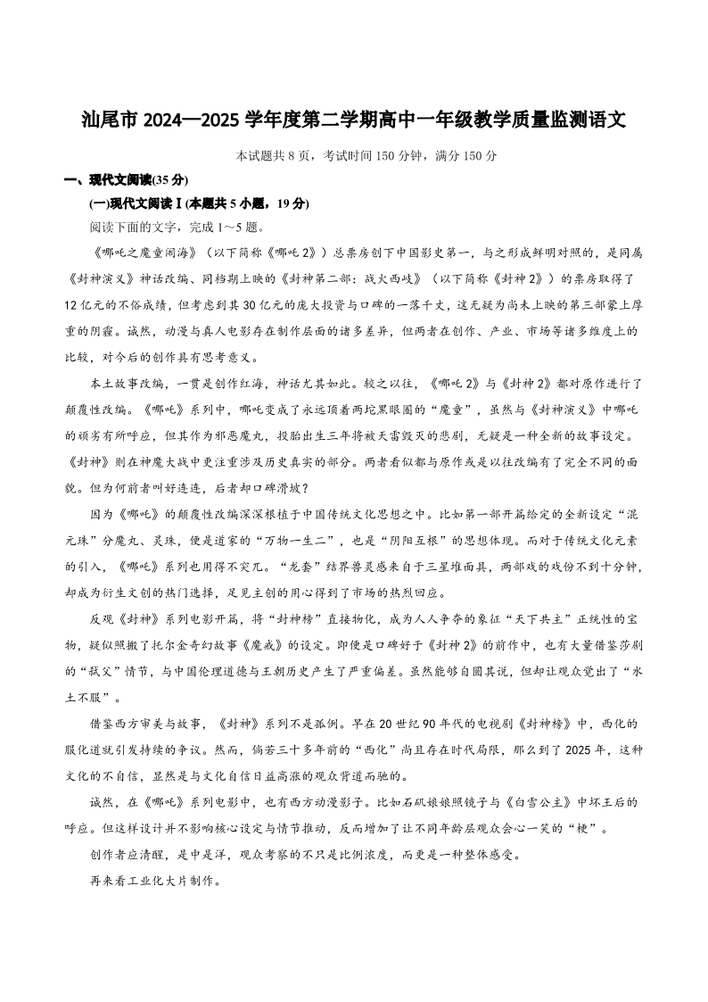 高一语文+答案--广东省汕尾市2024-2025学年高一下学期期末教学质量监测