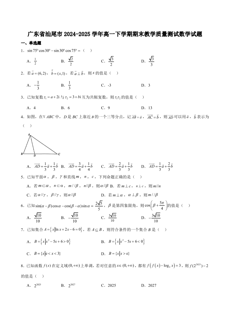 高一数学+答案--广东省汕尾市2024-2025学年高一下学期期末教学质量监测
