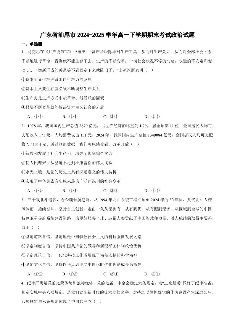 高一政治+答案--广东省汕尾市2024-2025学年高一下学期期末教学质量监测
