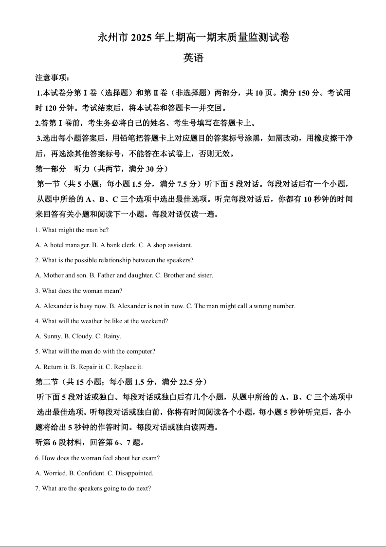 高一英语答案--湖南省永州市2024-2025学年高一下学期期末