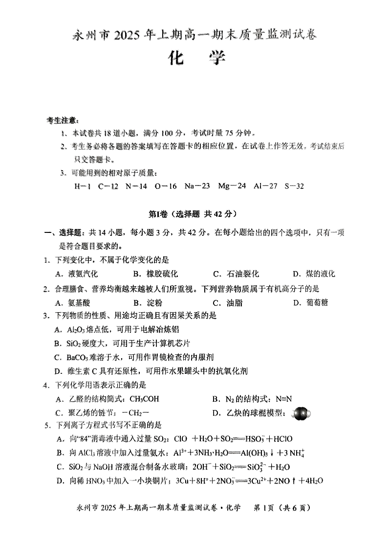 高一化学+答案--湖南省永州市2024-2025学年高一下学期期末