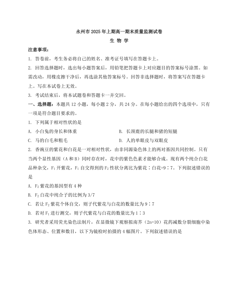 高一生物+答案--湖南省永州市2024-2025学年高一下学期期末