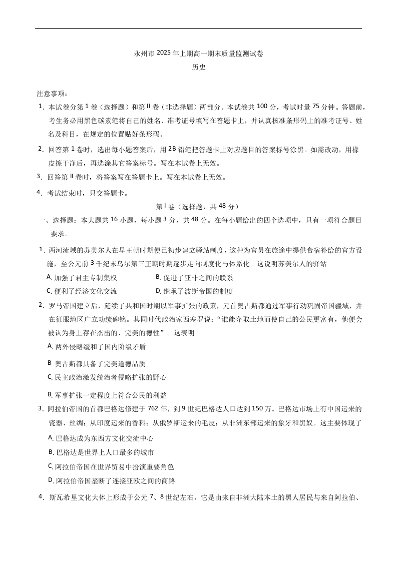 高一历史+答案--湖南省永州市2024-2025学年高一下学期期末