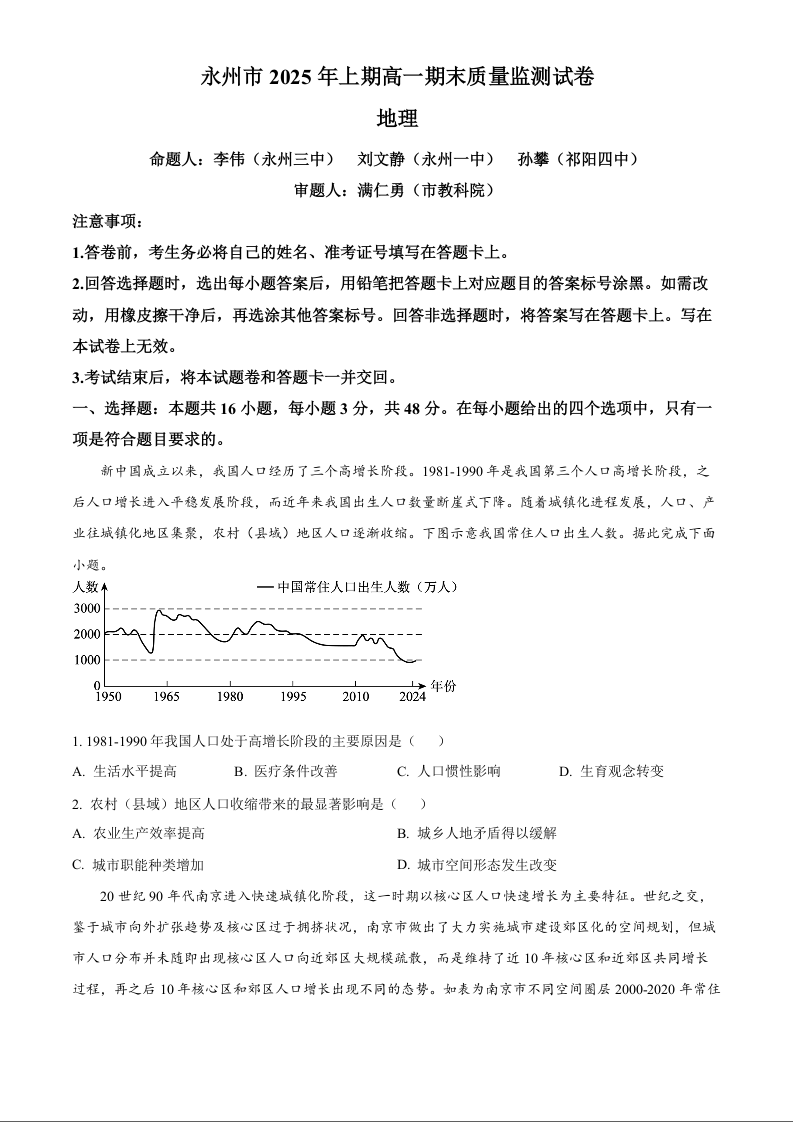 高一地理--湖南省永州市2024-2025学年高一下学期期末