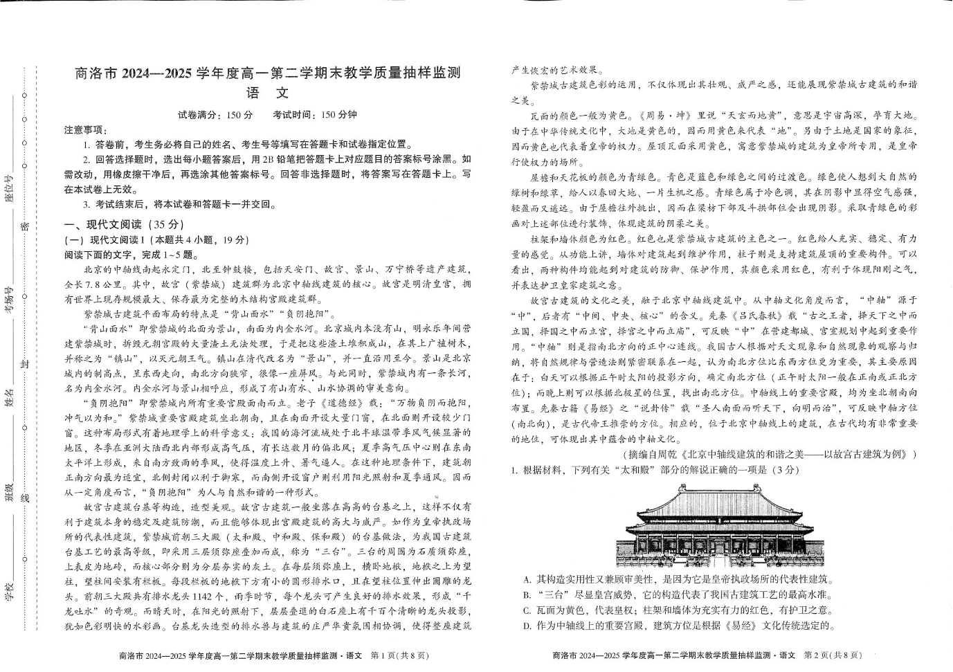 高一语文+答案--陕西省商洛市2024-2025学年高一下学期期末