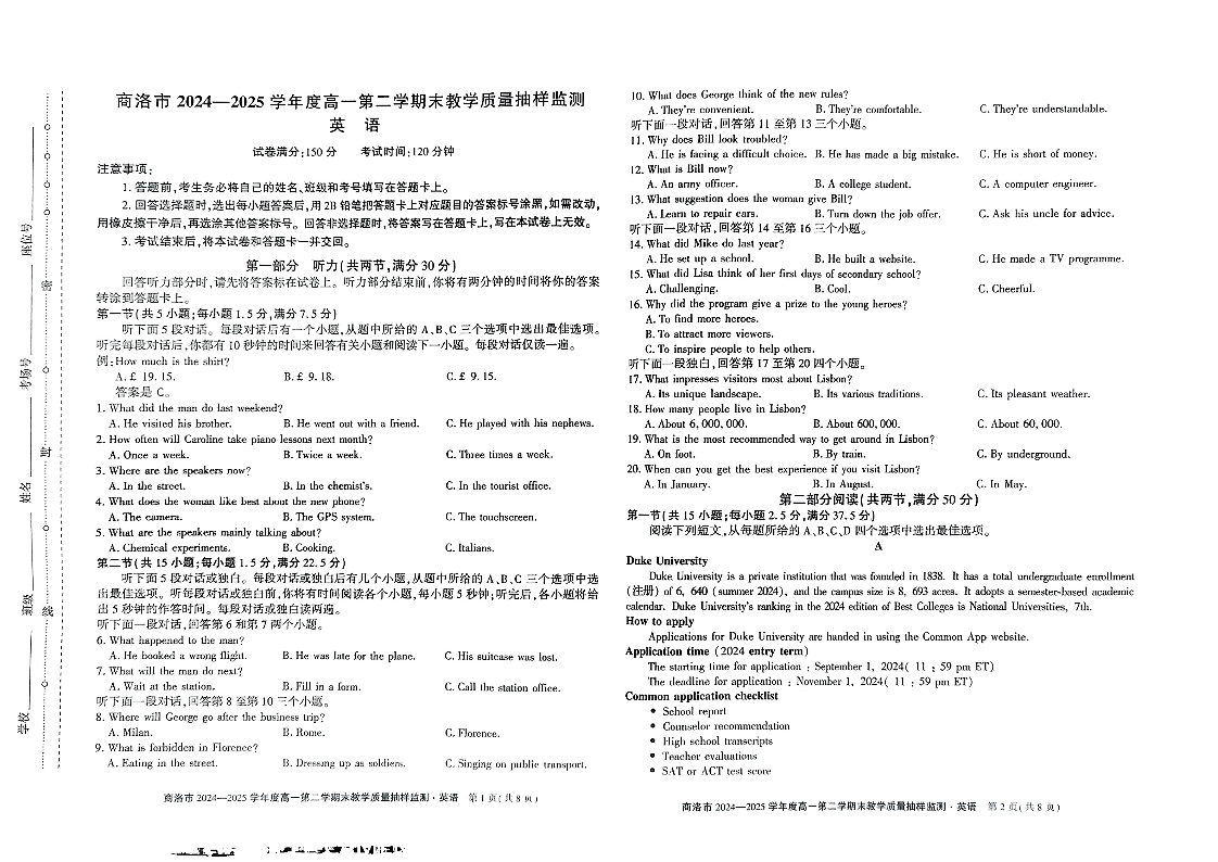 高一英语+答案--陕西省商洛市2024-2025学年高一下学期期末