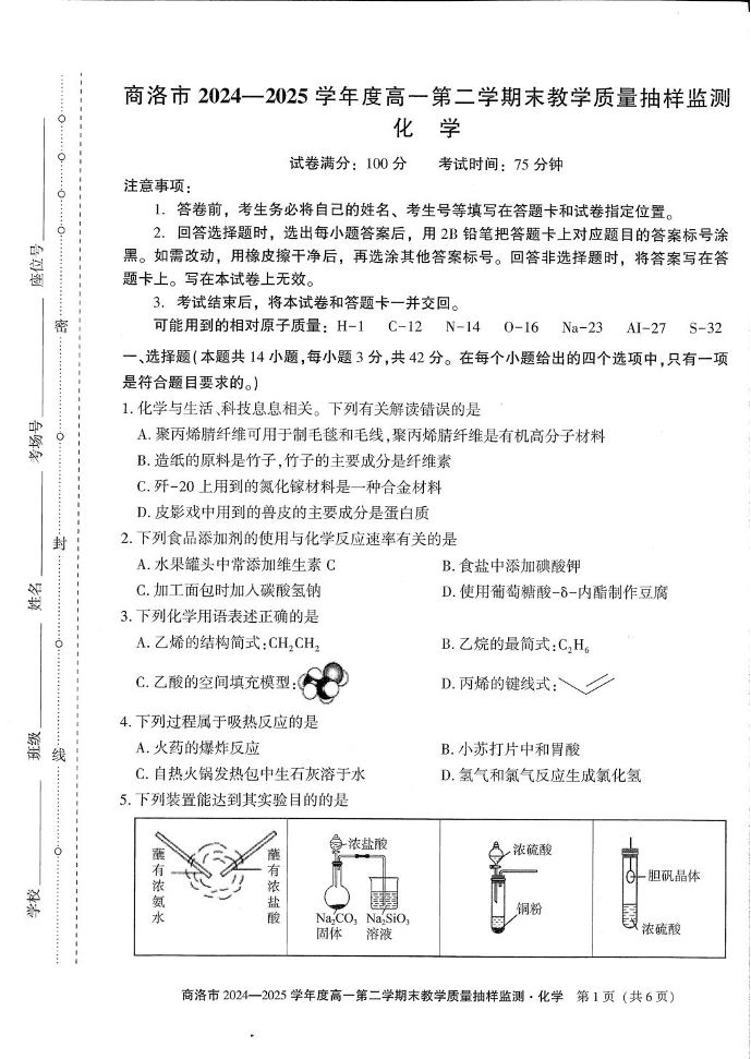 高一化学+答案--陕西省商洛市2024-2025学年高一下学期期末