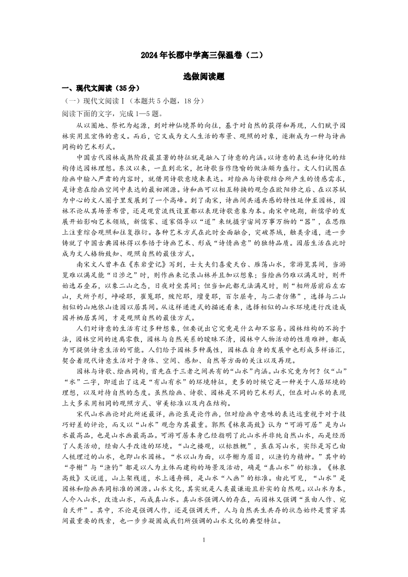 湖南省长郡中学2024届高三下学期考前保温卷(二)语文