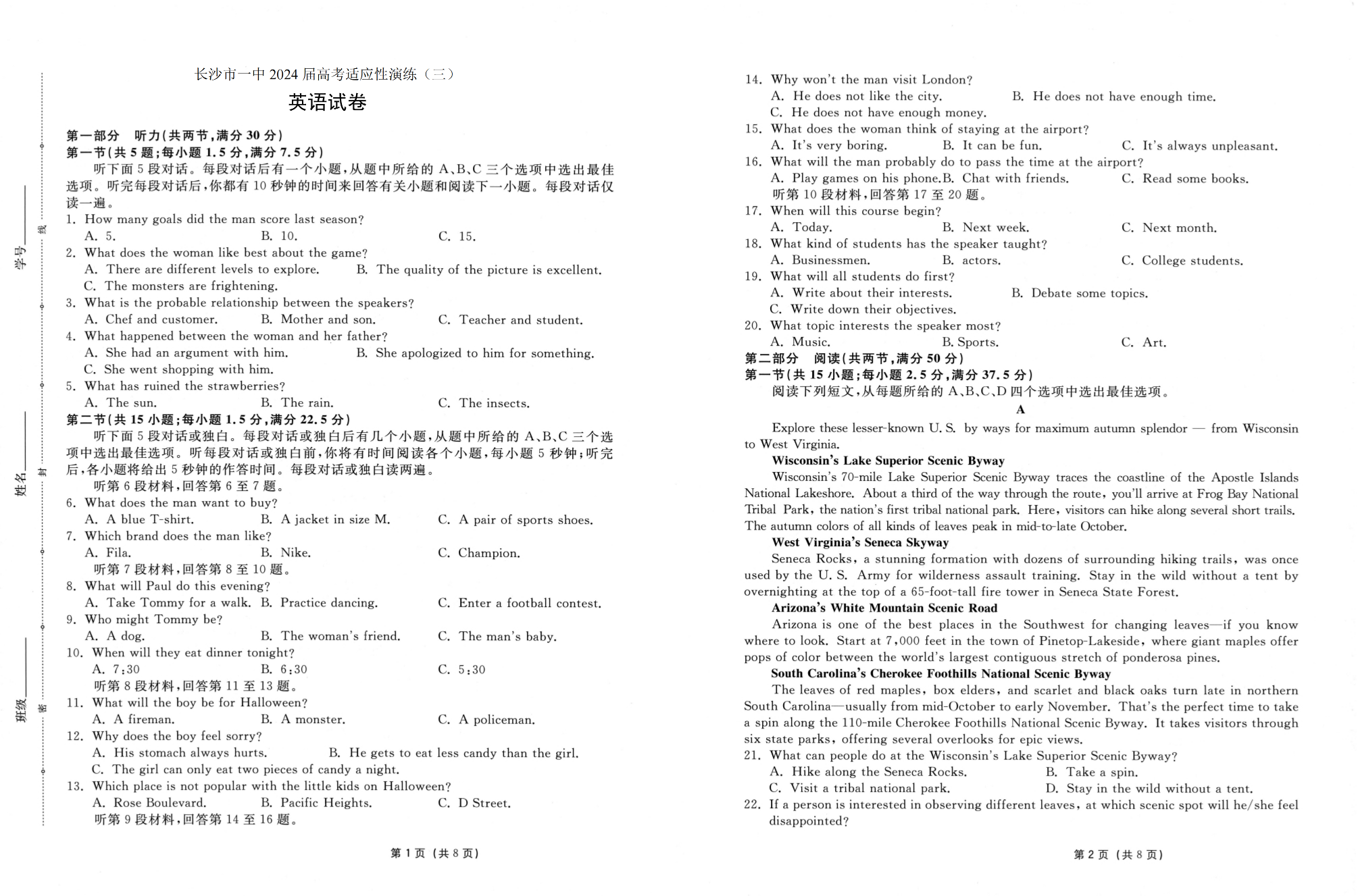 湖南省长沙市第一中学2024届高考适应性演练(三)英语