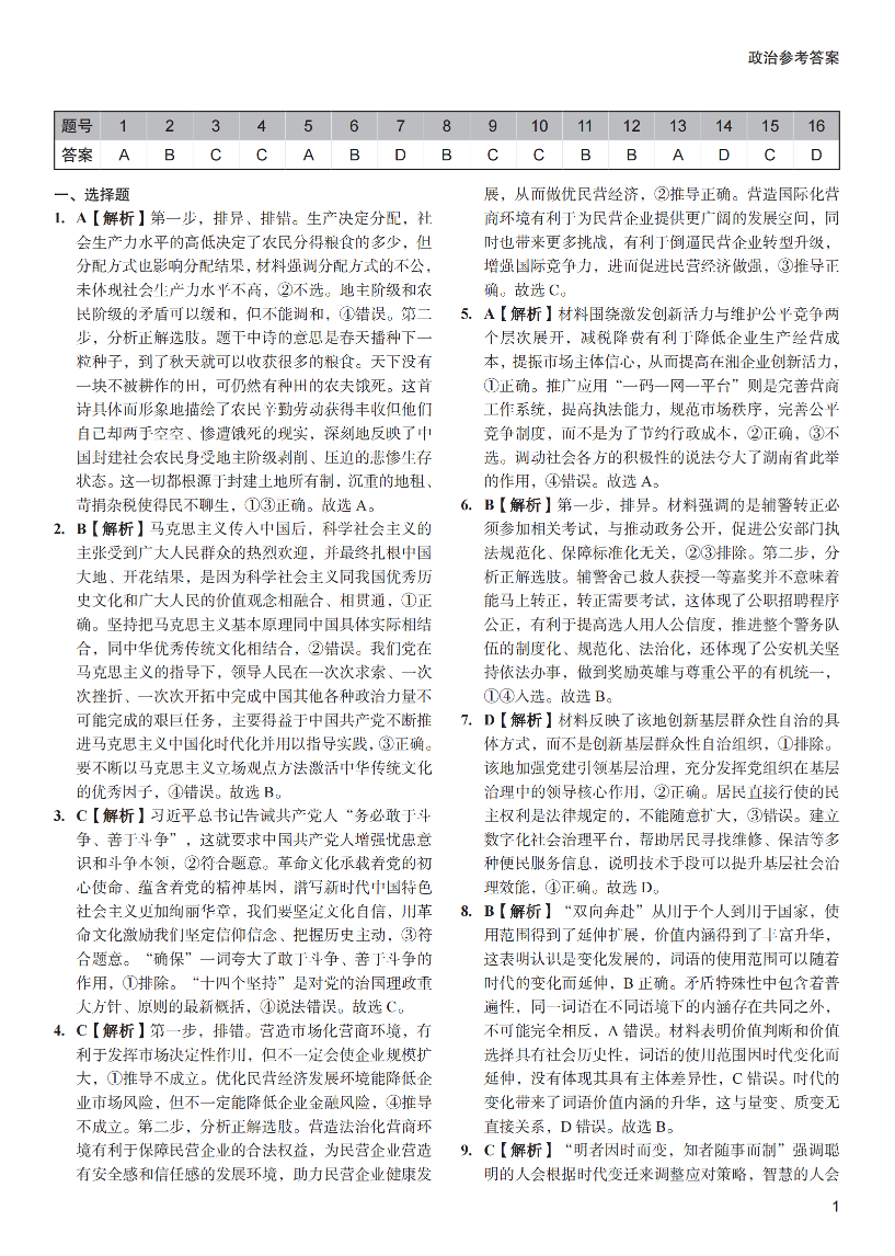 湖南省长沙市第一中学2024届高考适应性演练(三)政治答案