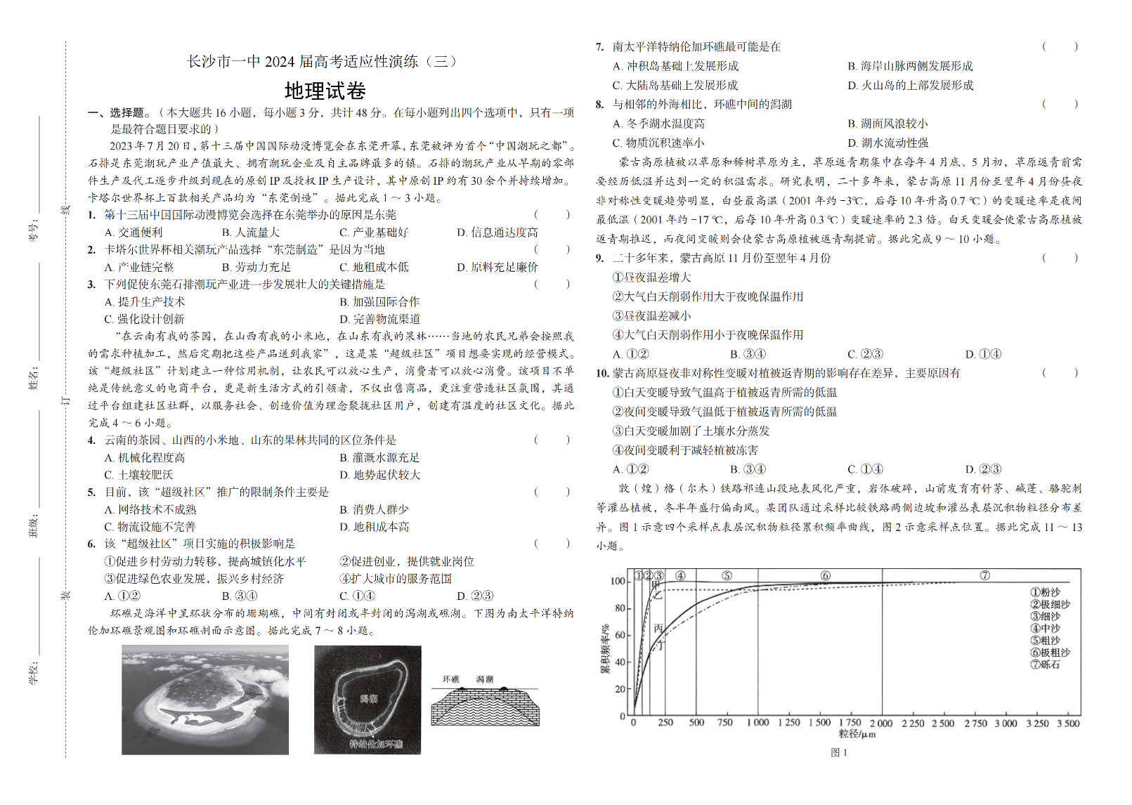 湖南省长沙市第一中学2024届高考适应性演练(三)地理