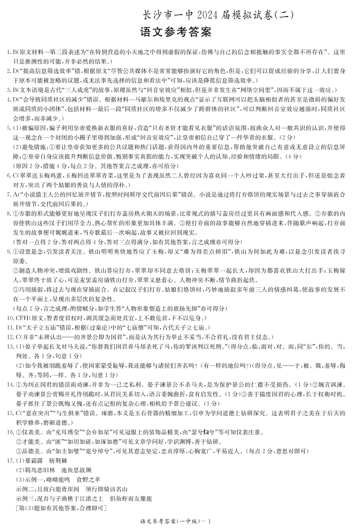 湖南省长沙市第一中学2024届高三模拟考试(二)语文答案