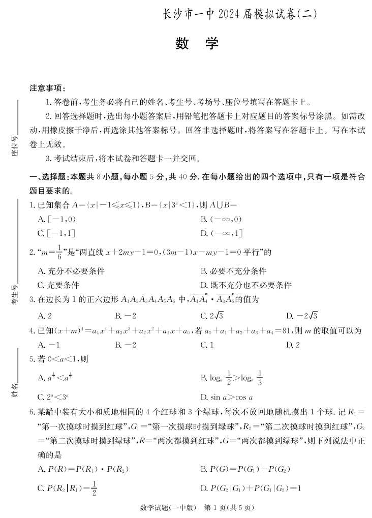 湖南省长沙市第一中学2024届高三模拟考试(二)数学