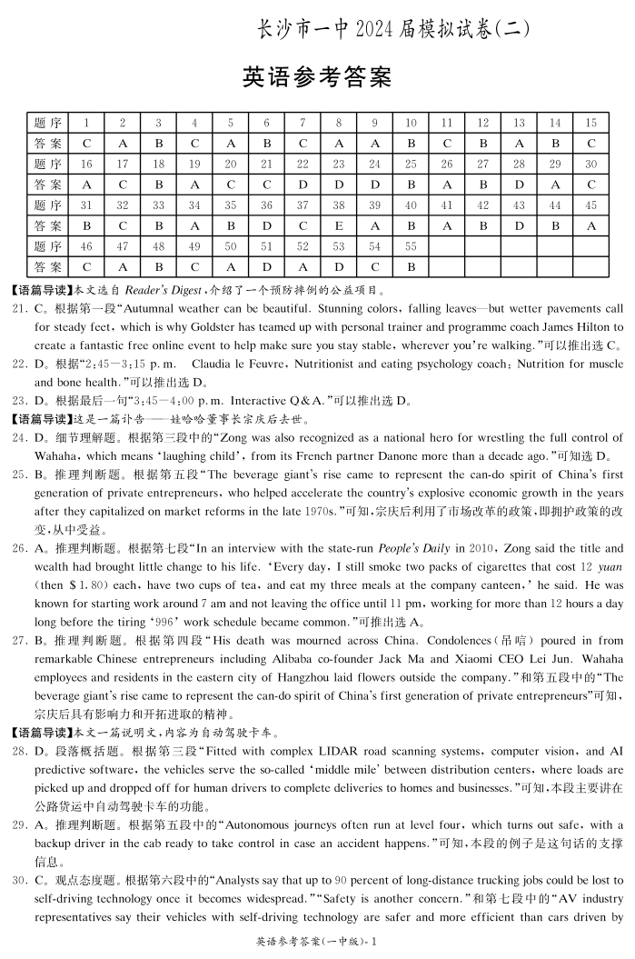 湖南省长沙市第一中学2024届高三模拟考试(二)英语答案