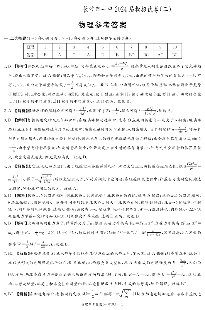 湖南省长沙市第一中学2024届高三模拟考试(二)物理答案