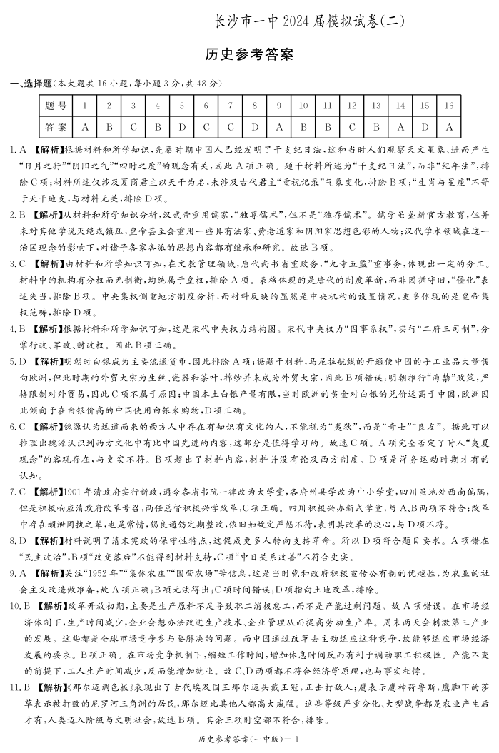 湖南省长沙市第一中学2024届高三模拟考试(二)历史答案