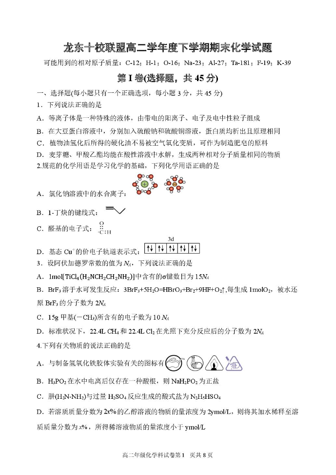 高二化学+答案--黑龙江省龙东十校联盟2024-2025学年高二下学期期末考试