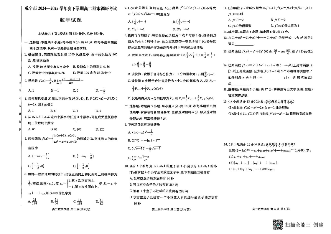 高二数学--湖北省咸宁市2024-2025学年高二下学期期末考试